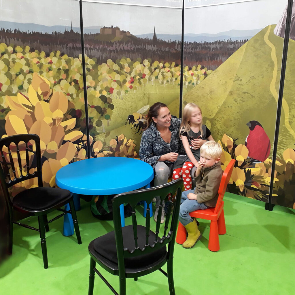 This illustration of Salisbury Crags was on two metre tall panels, divided into five sections, and used to create a reading area (see below).